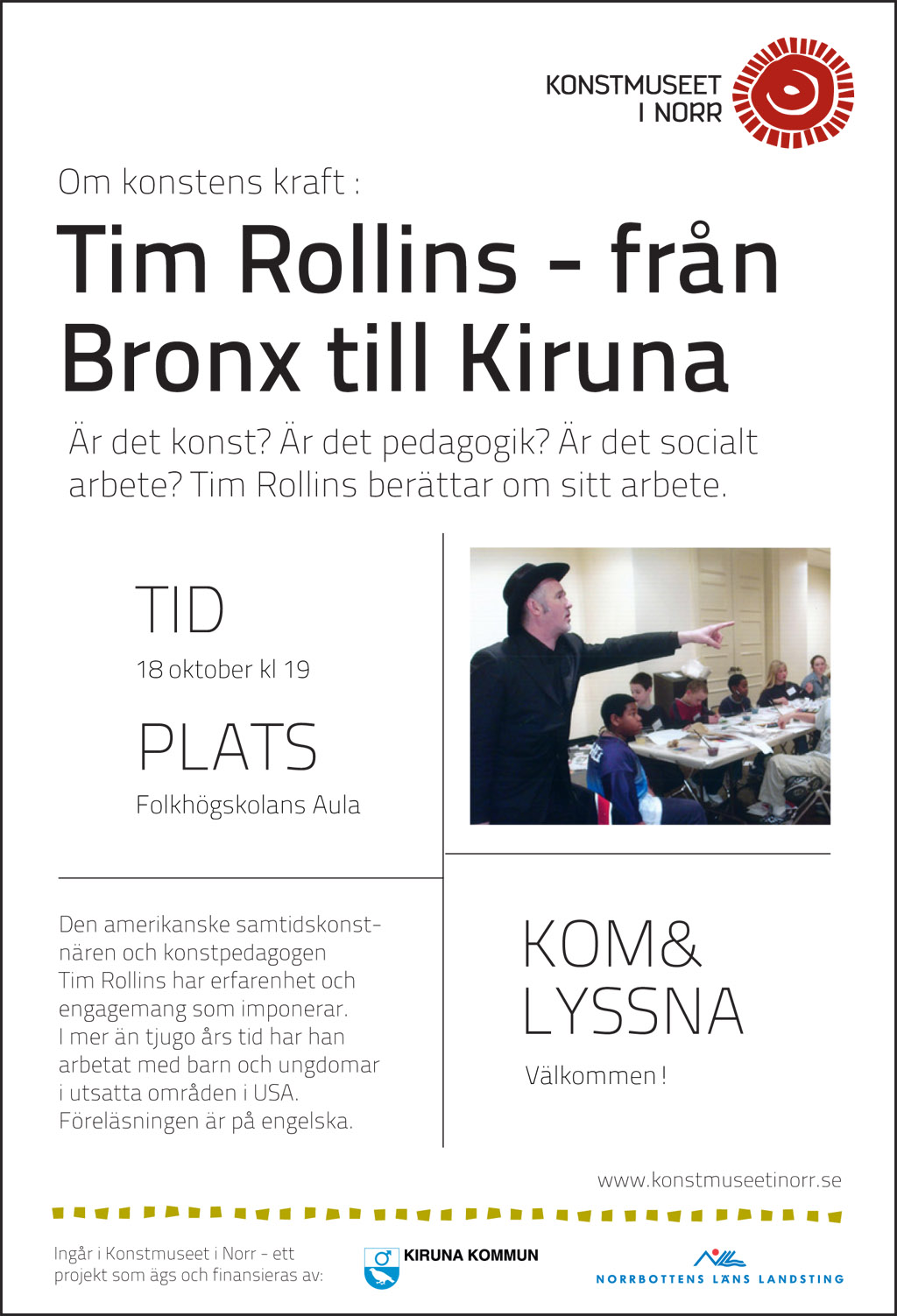 Den amerikanske samtidskonstnären och konstpedagogen Tim Rollins har erfarenhet och engagemang som imponerar. I mer än tjugo års tid har han arbetat med barn och ungdomar i utsatta områden i USA.